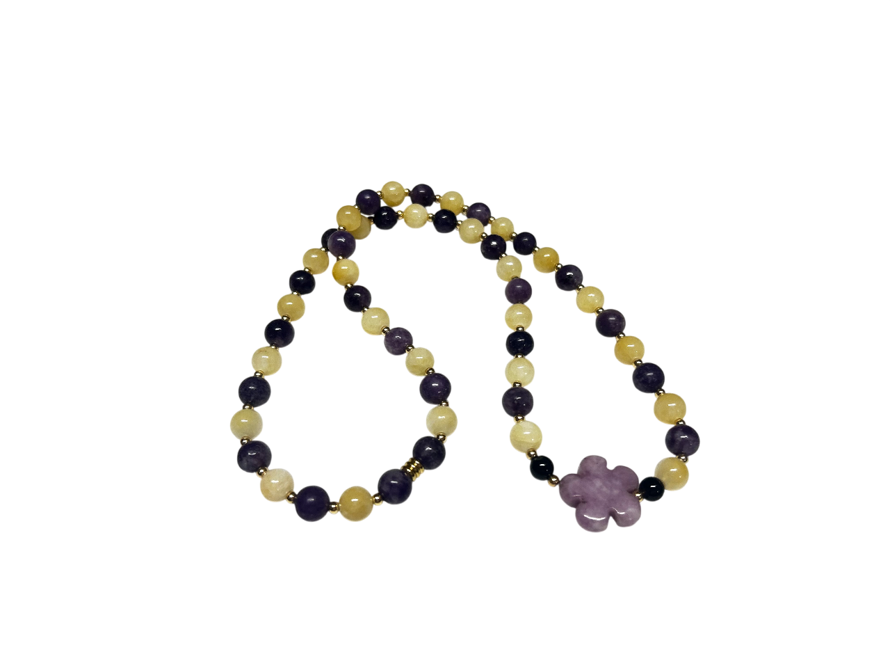 Um colar que combina clareza mental, equilíbrio emocional e serenidade espiritual, com uma estética suave e elegante, onde os tons solares do amarelo se harmonizam com a profundidade espiritual do roxo.